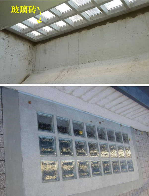 这种做法就比较少见了,玻璃砖和混凝土框架的组合,从美观性上来看,还蛮有特点的。玻璃砖也不影响天井下面的采光。
